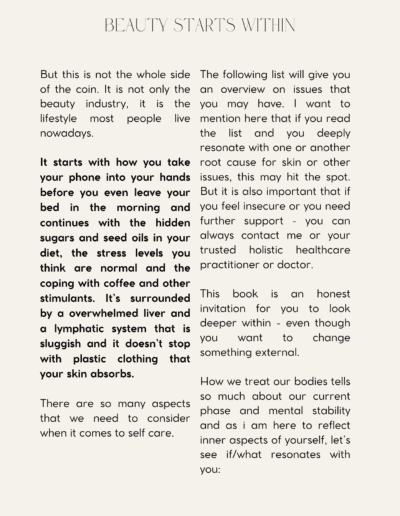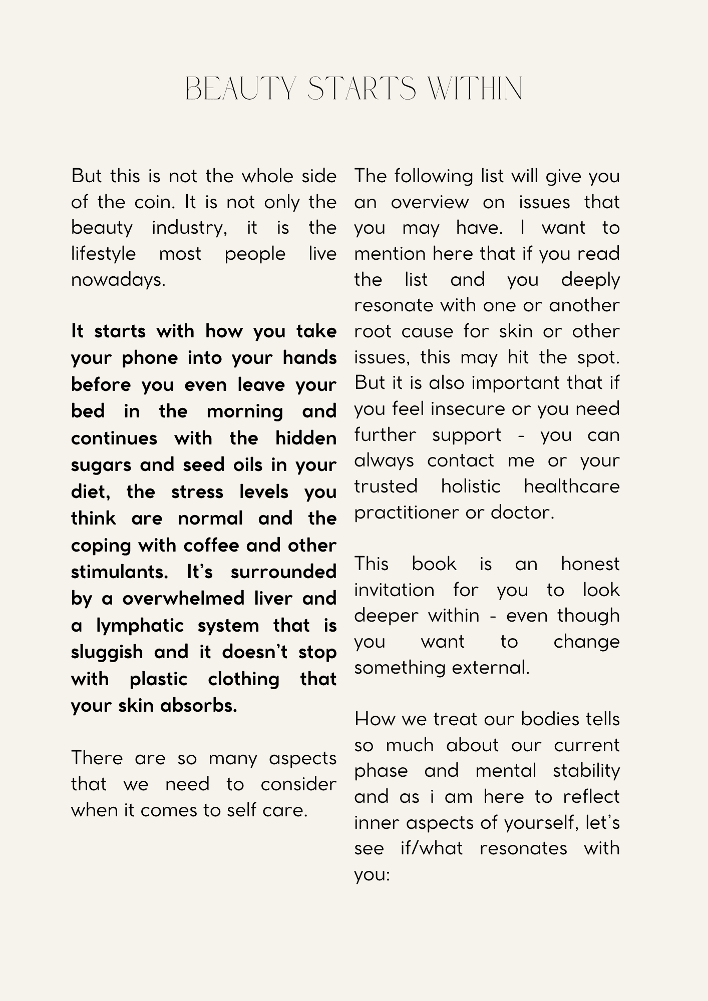 please read carefully: With this book I share information about natural self-care, including skincare, hair care, oral care, and holistic rituals. I do not provide medical advice, diagnosis, or treatment, nor do I recommend replacing professional medical guidance with any of the information in this book. I share my personal experience, research, and resources that are widely and legally accessible. I do not intend to harm, influence, or interfere with anyone’s personal health journey. This book does not replace any medical treatment or therapy. All content is for informational purposes only, and by engaging with it you agree to take full responsibility for how you choose to use and apply the information, with awareness and care.